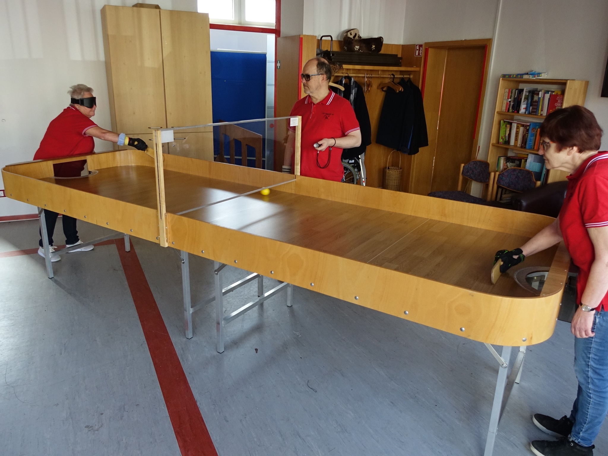 Eine Sportart, die inklusiv lebt. Zwei Blinde, Sehbehinderte und/oder Sehende stehen sich an einer Platte/Tisch gegenüber und versuchen mit Hilfe eines Holzschlägers den rasselnden Ball in das gegnerische Tor zu befördern. Zur Ausrüstung gehören auch noch eine Dunkelbrille und ein Schutzhandschuh an der schlägerführenden Hand. Gewonnen hat, wer als erster 11 Punkte erreicht hat. Showdown ist ein spannender Sport mit großem Spaß, bei dem Konzentration, Geduld, Kondition und Koordination gefördert werden. Jeder, der diesen Sport spielen oder erlernen möchte, ist bei uns herzlich willkommen. Weitere Fragen beantwortet Ihnen gerne unser Übungsleiter Helmut Schmitz.
